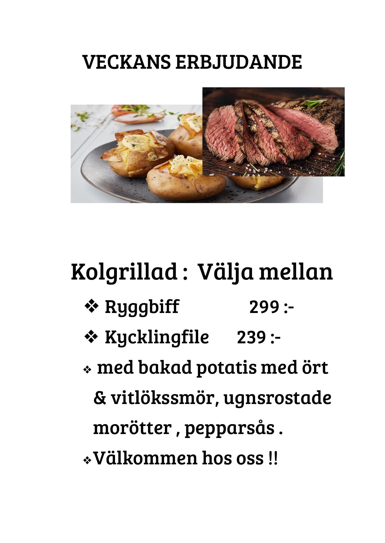 Veckans erbjudande Frame 2 Frame 3 Veckans Erbjudande – kolgrillad Ryggbiff – 299 :- Kycklingfilé 239 :- med bakad potatis med ört & vitlökssmör, ugnsrostade morötter och pepparsås Frame 1 Frame 2 Frame 3 Frame 1 Frame 2 Frame 3